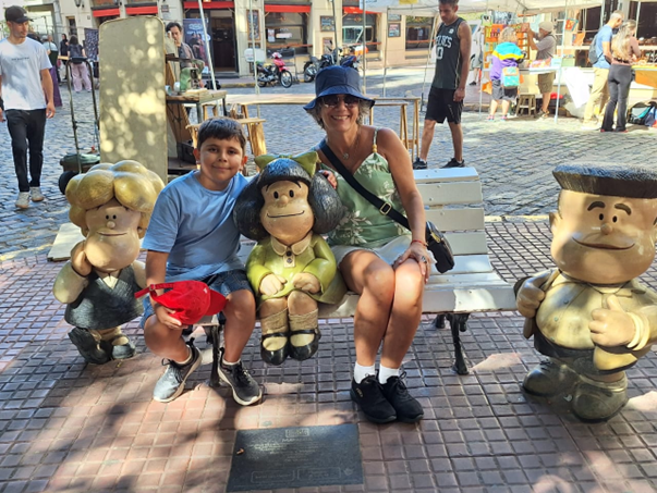 Réplica da Mafalda, a personagem carismática de histórias em quadrinhos criada pelo cartunista argentino Quino. A estátua mede aproximadamente 80cm. e está sentada em um banco com espaço para o turista sentar ao seu lado e fazer uma foto. Pode ter uma pequena fila, mas vale a pena esperar.
