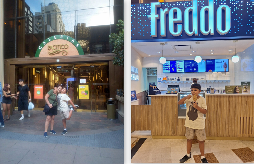 Lanche Valent Especialidades – 6 americanitos ($4.000,00), 2 sucos de laranja ($3.600,00), cerveja Miler ($5.000,00) Total= $12.600,00 (R$48,00 / U$9,00). No 3º. Piso da Galerias alimentação mais barata.Madison Café – bebida Mimosa Desay ($5.500,00), Mocaccino ($6.500,00), água com gás ($4.200,00). Total = $16.200,00 (R$61,00 / U$12,00)