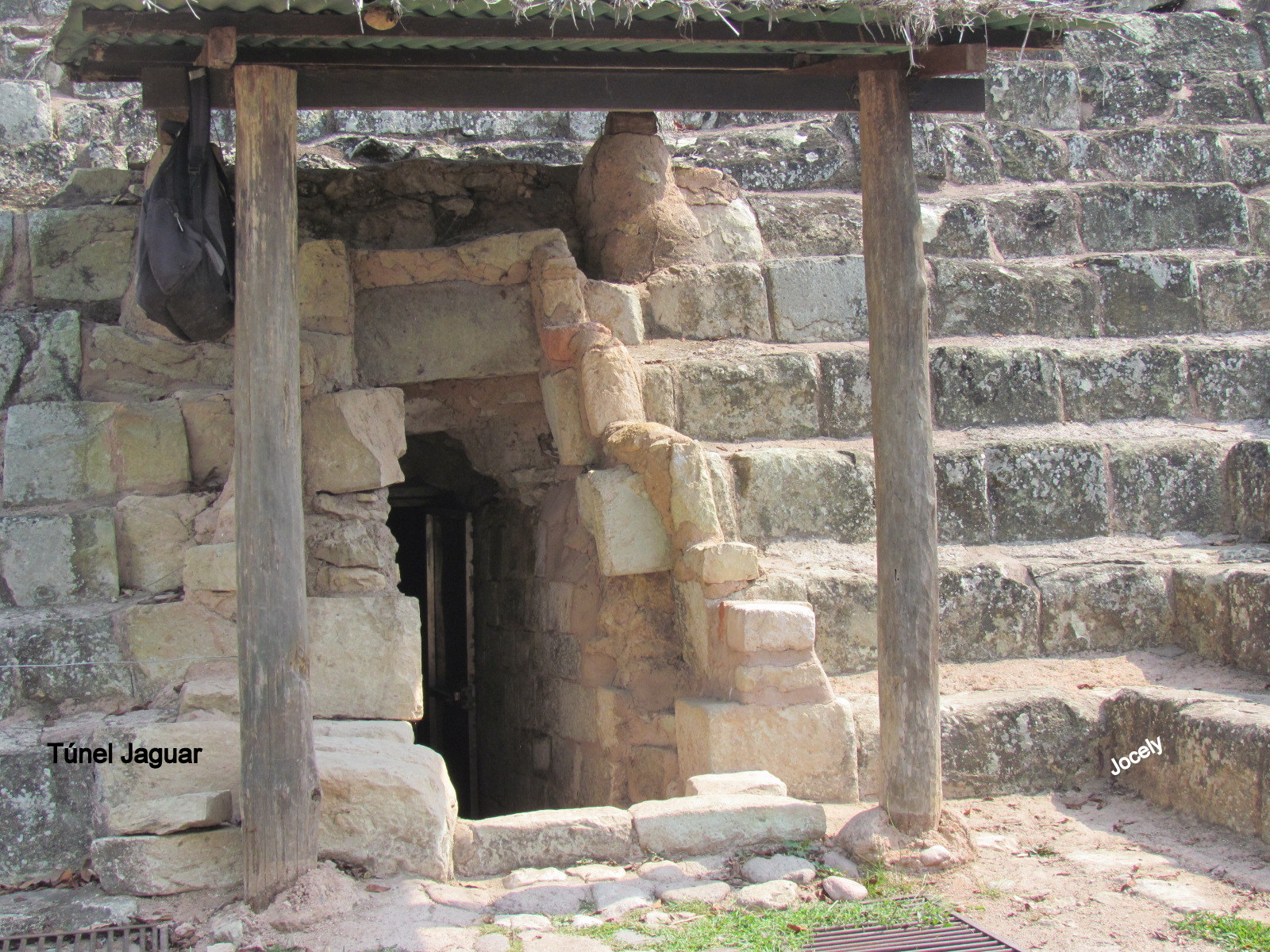 As 5 estátuas localizadas na escada representam os 5 reis anteriores a Humo Jaguar. Infelizmente não foi possível fazer a sequência na leitura dos glifos, já que alguns degraus se soltaram e saíram da ordem. Este templo possui uma cobertura de lona para proteger os glifos.