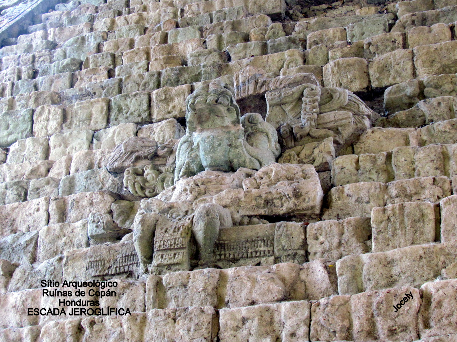 3. Escada Jeroglífica – esta edificação contém o maior texto conservado da civilização Maia. Foi erigido durante a viência do 15º. Rei conhecido como Humo Caracol e acredita-se ser uma espécie de árvore genealógica da dinastia de Copán, fundada por Yax-Kuk-Mo. Jocely